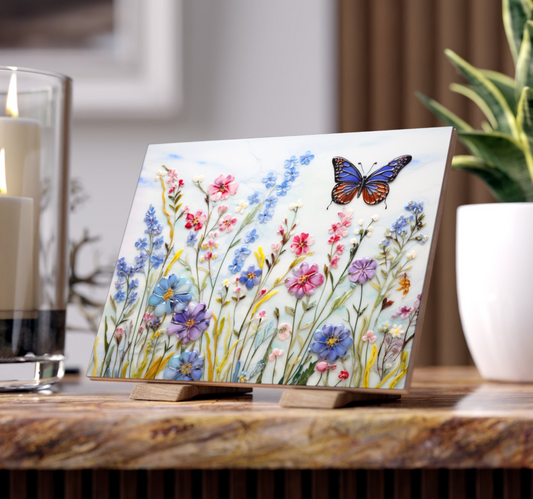 Butterfly in a Field of Wildflowers Tile, Ceramic Butterfly Tile, Ceramic Flowers Tile