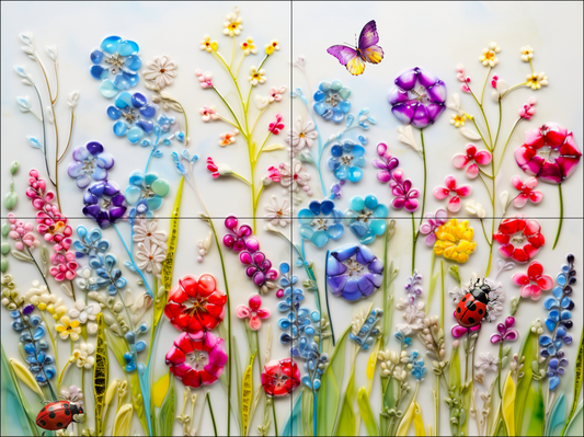 Ladybugs and butterfly among wildflowers ceramic tile mosaic.
