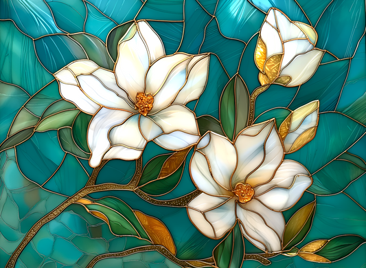 White Flowers in Turquoise Stained Glass Ceramic Tile Backsplash. Floral Kitchen Backsplash.