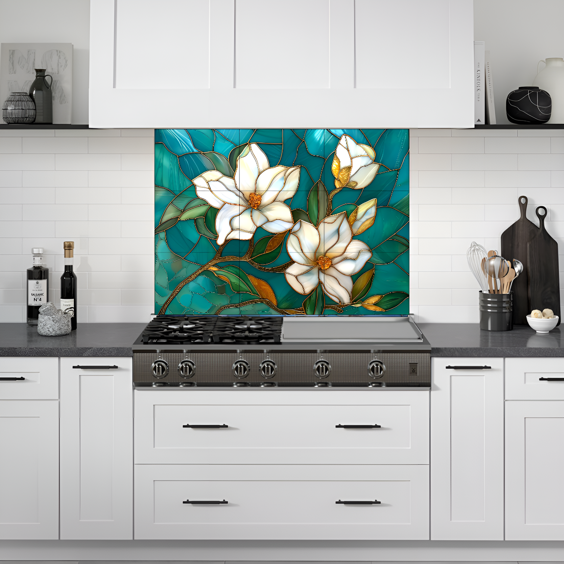 White Flowers in Turquoise Stained Glass Ceramic Tile Backsplash. Floral Kitchen Backsplash.